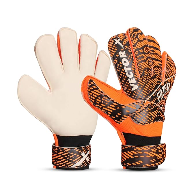 ector X FAZER Goalkeeper Gloves | for Multipurpose use Strong Grip for The Toughest Saves | with Finger Spines to Give Splendid Protection and Comfort | Finger Saver | (8, White-Orange-Black)